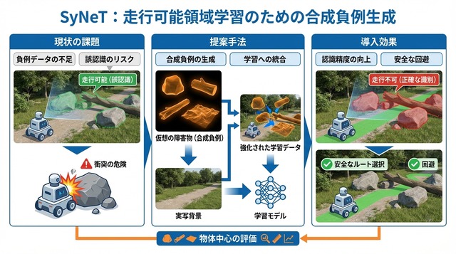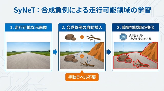 従来の自己教師あり学習では「走行可能な領域」のデータは得やすい一方で、「走行不可能な領域」を明示的に示すデータが不足しがちであった。SyNeTは合成的に生成した負例(ネガティブサンプル)を学習に組み込むことで、この課題を解決する。