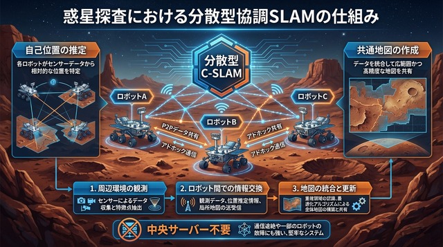 さらに、分散型C-SLAMは中央サーバーに依存しない設計が特徴である。各ロボットが対等な立場で情報を交換し、自分の地図を更新する。これにより、通信インフラが整っていない惑星環境でも動作可能になる。