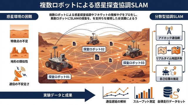 この協調により、各ロボットが異なる視点から同じ場所を観測できるため、自己位置推定の精度が向上する。また、1台が通信圏外に出ても他のロボットが補完できるため、ミッション全体の頑健性が高まる。惑星探査では人間が遠隔操作できる範囲が限られるため、ロボット同士が自律的に協調する仕組みが不可欠である。