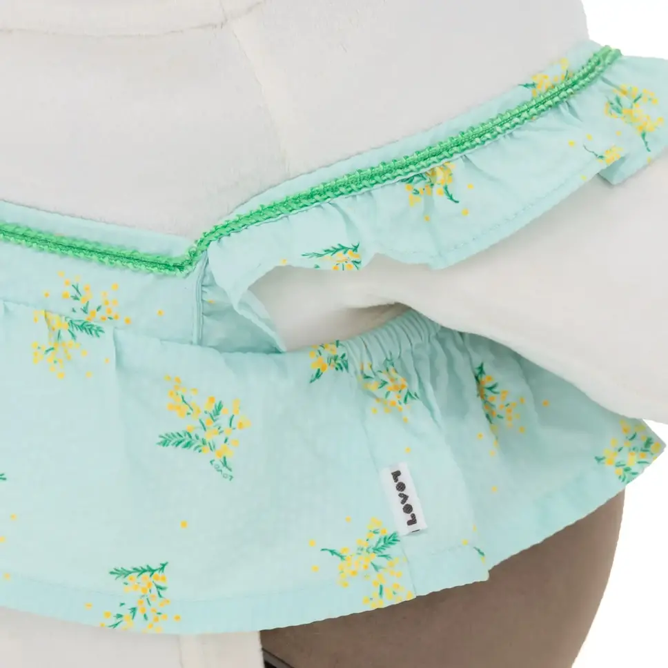 後ろ姿まで愛らしいフリルとリボンのディテールで、360度どこから見ても華やかな仕上がりとなっている。やさしい色合いのオフホワイトと、爽やかなミントグリーンの2色展開で、価格は9,980円(税込)。