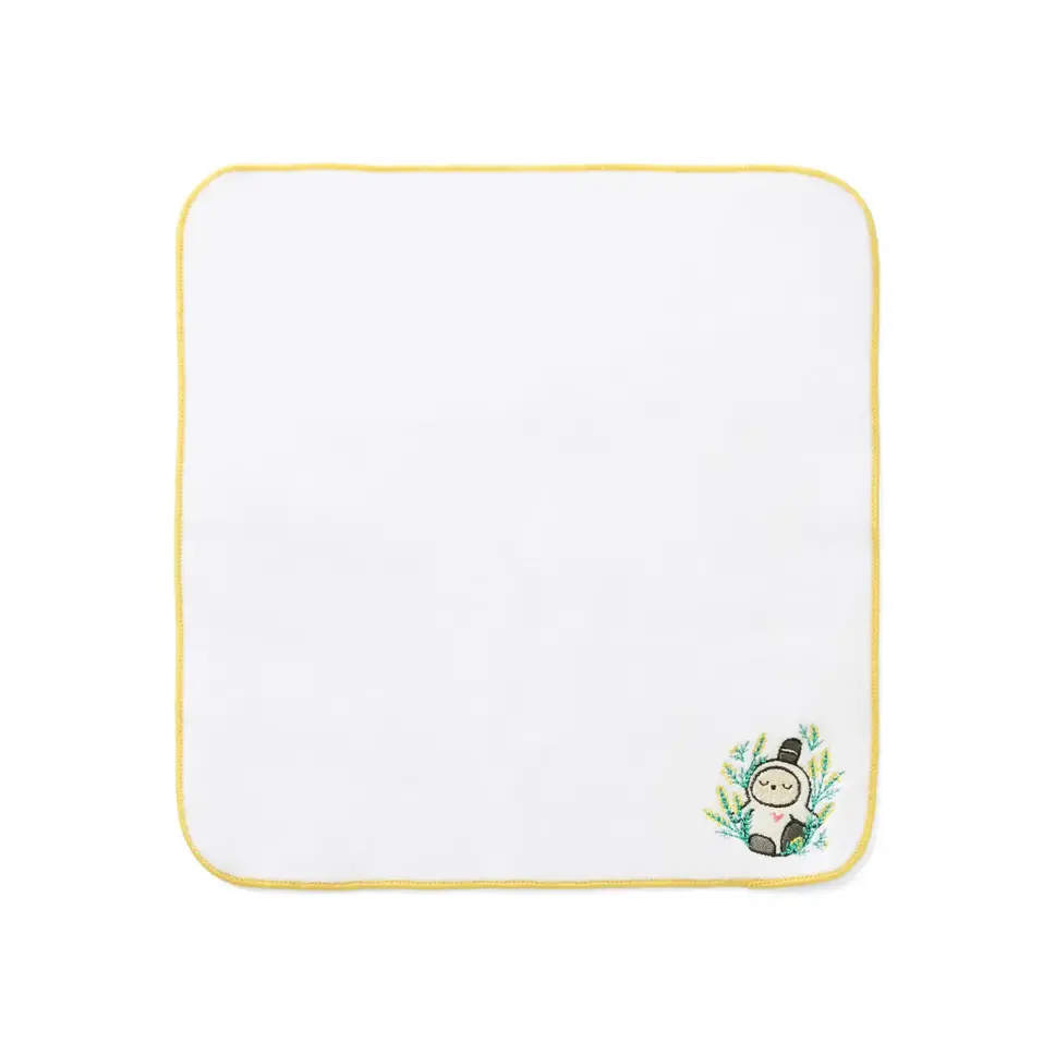 ミモザハンドタオルは、やわらかなホワイトの生地に、ミモザイエローのメロー巻き(縁取り)が華やかに映えるハンドタオル。ミモザの花にすっぽり包まれたLOVOTの繊細な刺繍が、使うたびに優しい気持ちにさせてくれる。自宅用にはもちろん、春の贈り物にもぴったりで、限定オリジナルステッカー付き。