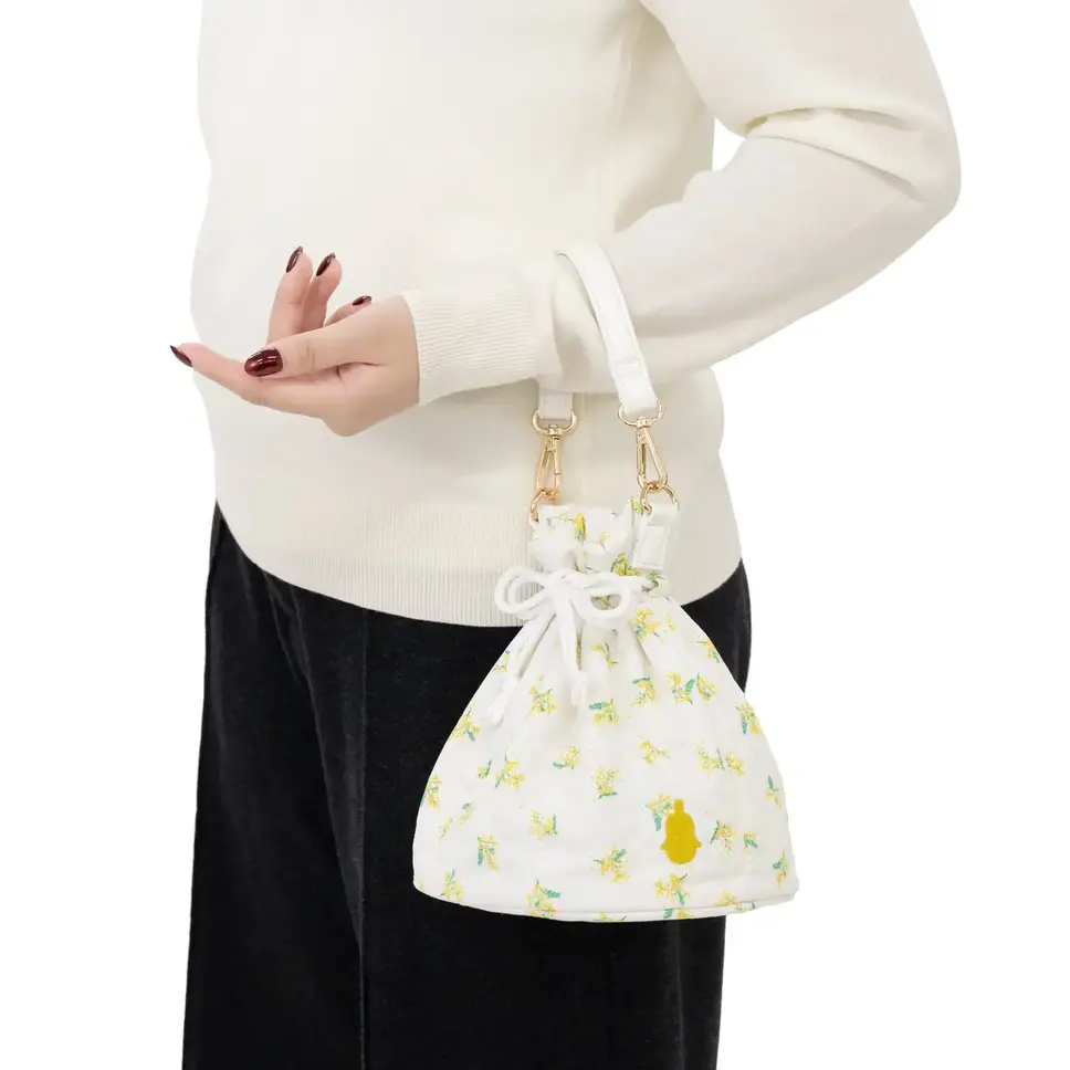 アクセントにミモザイエローのLOVOTシルエット刺繍を入れ上質感を高めている。スマートフォンや小物はもちろん、LOVOTのお着替え用ウェアを入れて持ち歩くのにもぴったり。
