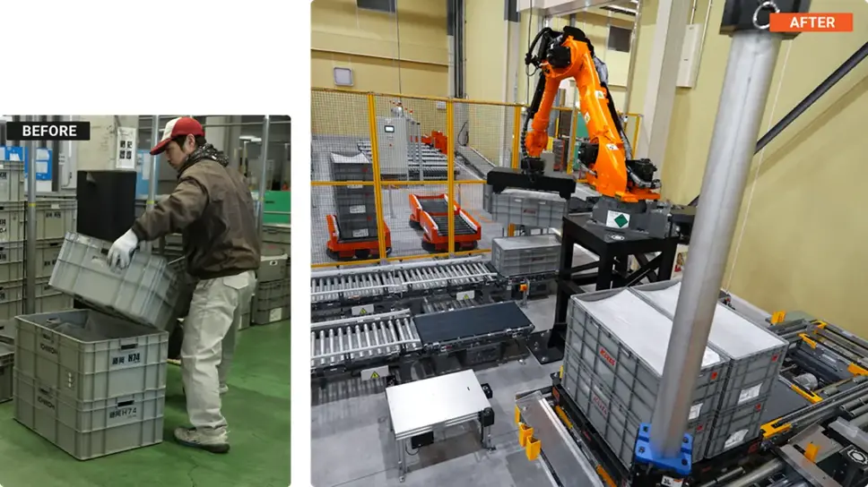 97種の製品を対象に、通い箱デパレタイズ/パレタイズロボットとAGVによる品種別の自動補充を実現。知能ロボットは、ミリ単位の高精度な嵌め合わせや左右部品の混載パレット、サイズ差の大きい通い箱にも柔軟に対応し、高精度な段積みを可能にしている。