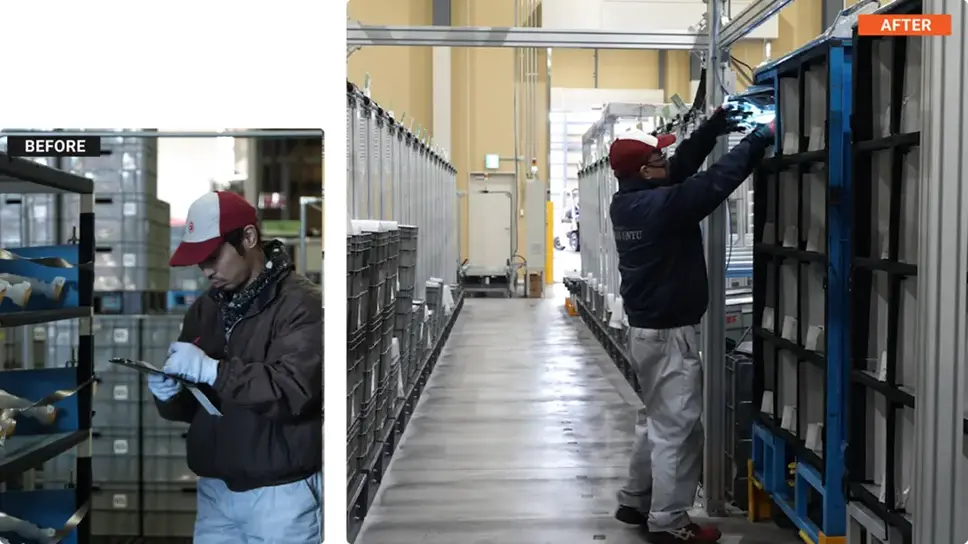 完成車メーカーの部品供給を担う日本運輸の倉庫も同様に、サプライヤー各社から集約された部品ピッキング作業の多くが、人手と属人的な判断・作業に依存していた。