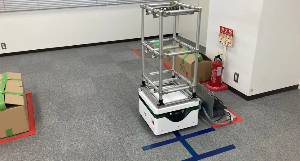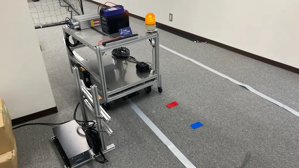 AGVデモ機ではタクマ精工社製ユニットを使用し、テープに追従して自動走行する様子を確認できる。