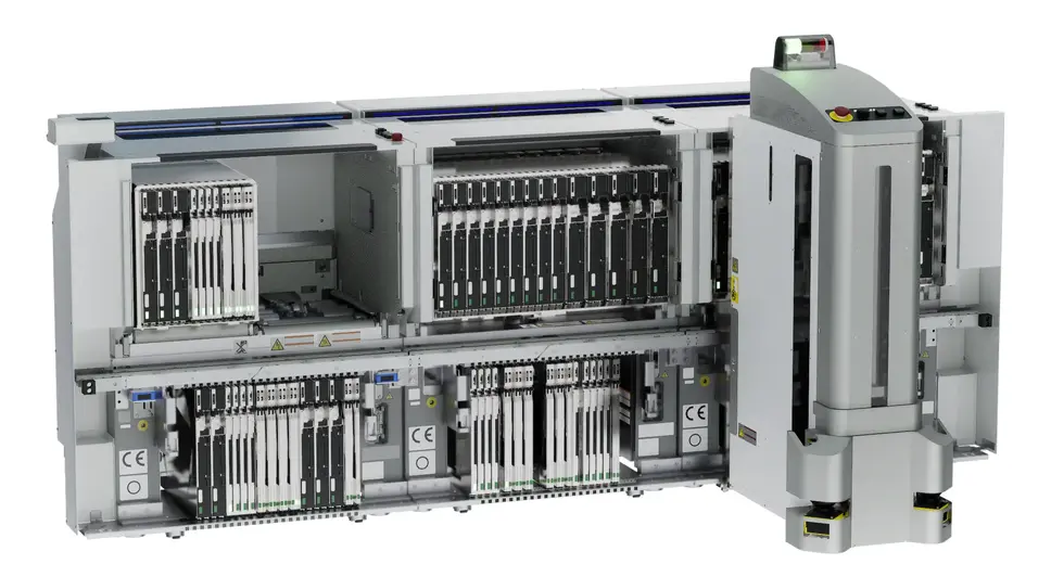 スマートストレージは、外段取りエリアにおいて電子部品を装置へ供給するフィーダーの保管・仕分け・供給を自動化するユニットだ。生産スケジュールに基づき必要なフィーダーを保管スペースから自動で収集し、AMR(自律搬送ロボット)によって生産ラインへ搬送する。