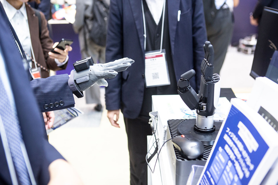 また、センサー付きグローブを使って五指ハンドを動かす体験コーナーも用意されている。(NVIDIA GPU × NVIDIA IsaacによるフィジカルAI実装アプローチとして、遠隔操作による5指ロボットハンドの模倣学習データ取得体験)