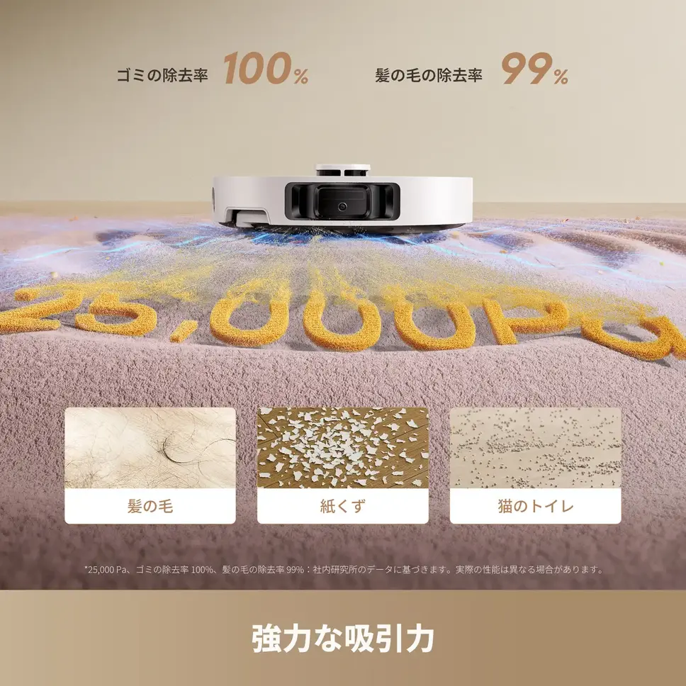 本製品の中核を担うのが、第6世代TurboForceモーターによる25,000PaのVormax吸引技術だ。髪の毛やホコリ、猫砂まで対応し、ゴミ除去率99%・髪の毛除去率99%を達成している。