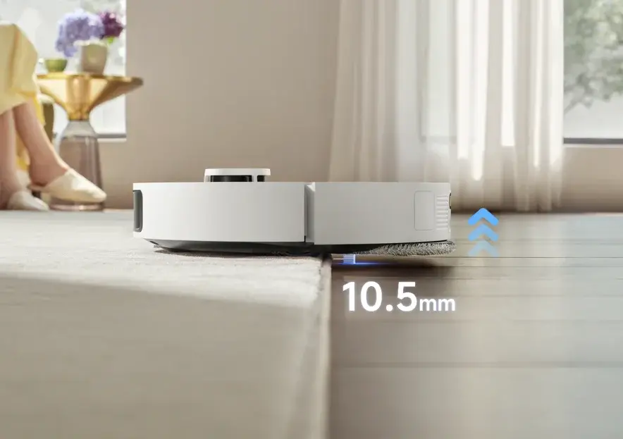 デュアルフレックスアームテクノロジーにより、サイドブラシとモップパッドが最大4cmまで自動で伸長し、壁際や狭い隅まで清掃が可能だ。丸みのある家具周りもスムーズに走行し、清掃範囲を広くカバーする。