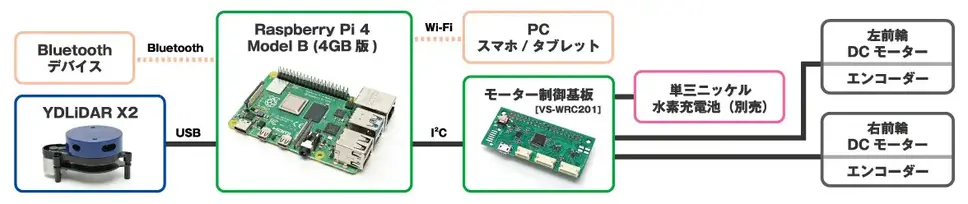 電源は別売の単3ニッケル水素充電池4本を標準とするが、市販のモバイルバッテリーによる給電も可能だ。電源口はモーター制御基板VS-WRC201のUSB Micro-B端子、またはRaspberry Pi 4基板のUSB Type-C端子から選択できる。ただし、ROS 2環境での運用時は電源安定性の観点からRaspberry Pi 4基板のUSB Type-C端子からの給電が必要となる。